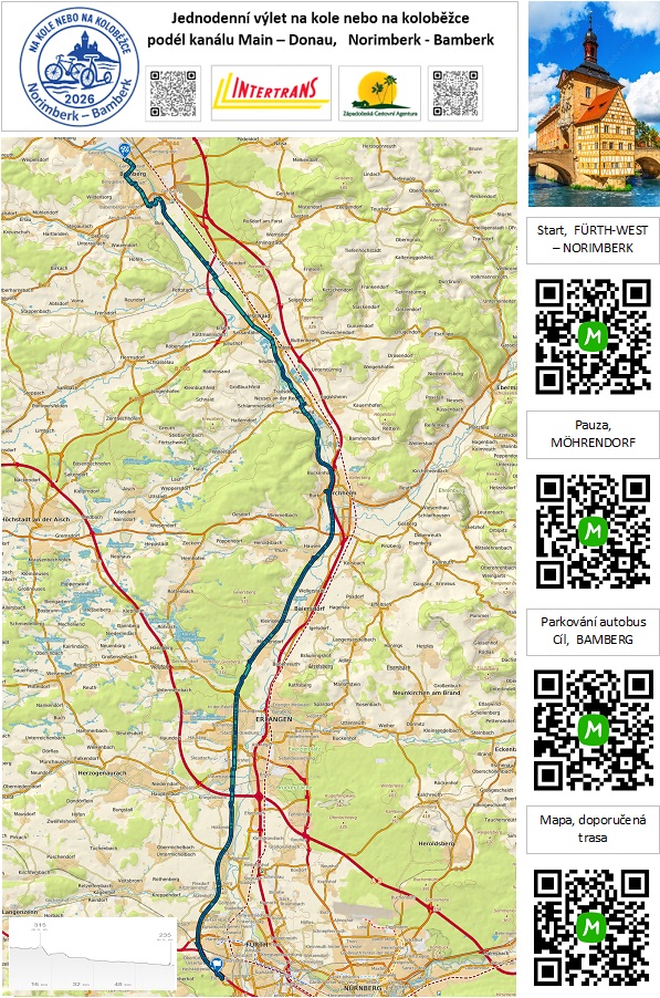 PROGRAM: odjezd z Plzně v 06.00 hod. (Svatá Kateřina v 06.50 hod.), dopoledne příjezd do městečka Fürth, individuální prohlídka historického centra a odjezd na kole/ koloběžce podél průplavu směrem Bamberk. Cyklotrasa protíná vesničky s hrázděnými domy a míjí technické unikáty. V městečku Möhrendorf (na 24. km) bude zázemí autobusu, zde si budete moci odpočinout, občerstvit se, nebo jízdu na kole/ koloběžce přerušit a nechat se odvézt autobusem do Bamberku a tam pokračovat prohlídkou, nebo naopak, svoji jízdu na kole/ koloběžce z Möhrendorfu teprve zahájit. V Bamberku opětzázemí autobusupoblíž centra, po dojezdu do Bamberku bude dostatek času na projížďku či prohlídku malebného historického centra. Odjezd v 19.30 hod., předpokládaný příjezd do Plzně ve 23.00 hod.
